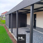 Ce carport ouvert, avec ses lignes épurées et sa structure robuste en aluminium, s’intègre harmonieusement dans la propriété. L’abri de jardin apporte un espace de rangement supplémentaire, tandis que la marquise ajoute une touche pratique en protégeant l’entrée tout en renforçant l’esthétique de la façade.