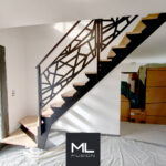 La rampe est l’un des points forts de cette réalisation. Elle est ornée d’un motif Tohyo réalisé par découpe laser, qui apporte un effet visuel unique et dynamique. Ce motif, inspiré de l’art abstrait, donne à la rampe une dimension artistique et renforce l’aspect contemporain de l’ensemble. Le garde-corps en verre associé complète le design en laissant passer la lumière, tout en assurant sécurité et élégance.