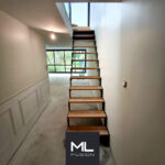 Le limon central, discret, libère la perspective et souligne la géométrie stricte du Mondrian 700. Les marches en hévéa – bois clair et veinage doux – contrastent élégamment avec la structure métal noire, créant un jeu de matières qui s’intègre dans tout décor contemporain.