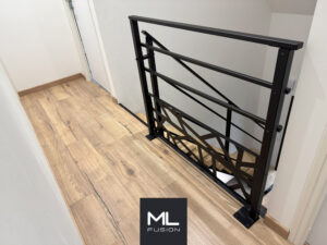 •Un garde-corps 2 sous-lisses avec un soubassement en découpe laser, arborant le motif Tokyo. Ce motif ajoute une dimension artistique, tout en s’intégrant harmonieusement au design général de l’escalier.