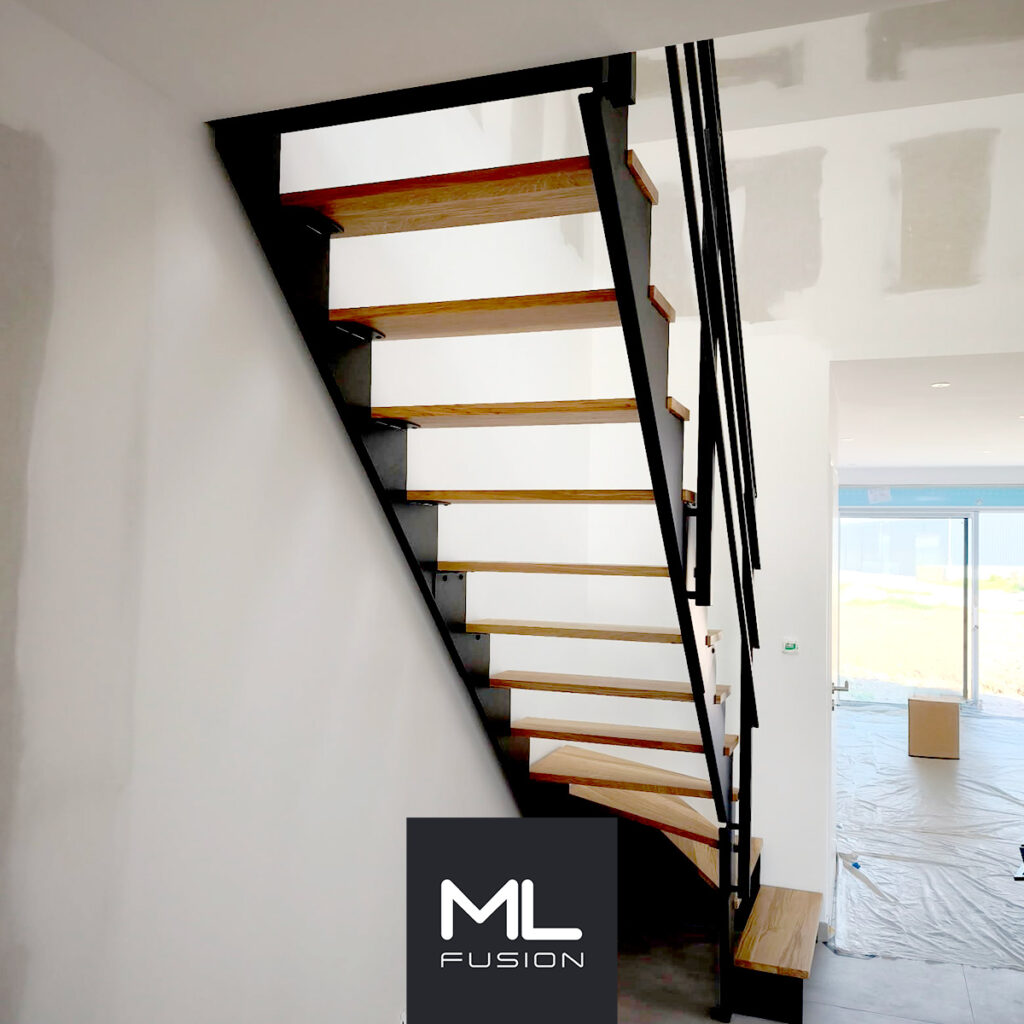 Dans une maison rénovée à Armentières, ML Fusion a conçu et posé un escalier Katz 700 en quart tournant gauche. Ce modèle signature, avec son limon central ajouré en croix, associe la chaleur du bois d’hévéa massif à la solidité d’une structure métallique thermolaquée noire.