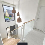 L’escalier est doté d’un garde-corps et d’une rampe en verre, offrant une transparence qui amplifie la sensation d’espace tout en ajoutant une touche sophistiquée. Le verre permet de maintenir une vue dégagée et d’apporter une lumière naturelle, créant une ambiance lumineuse et aérée.