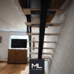 Nous avons été sollicités pour réaliser un escalier moderne qui s’intègre harmonieusement dans cet intérieur. Notre modèle Stael, équipé d’un limon central en acier thermolaqué noir, dessine des lignes épurées et aériennes. Les marches en bois clair apportent une touche chaleureuse tout en assurant une grande résistance. La rambarde avec découpe au motif Tokyo sécurise l’ensemble et ajoute une note graphique originale. Cet escalier 1/4 tournant relie avec élégance les deux niveaux de la maison et met en valeur le mur en brique peint.