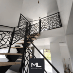 Un escalier central qui structure l’espace et signe le style de la maison. Nous avons fabriqué et posé ce modèle Stael en métal et bois avec lames d’hévéa et garde-corps en découpe laser motif “Tokyo”. Le limon central acier donne de la légèreté, tandis que les panneaux découpés au laser forment un garde-corps graphique jusqu’à l’étage pour une continuité visuelle nette.